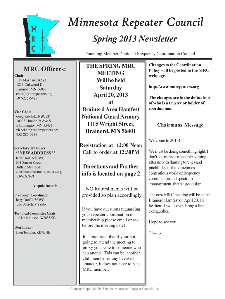 Minnesota Repeater Council Spring 2013 Newsletter Founding Member: National Frequency Coordination Council MRC Officers: Chair Jay Maynard, K5ZC 1831 Oak wood Dr. Fairmont MN 56031 chair×at)repeaters.org