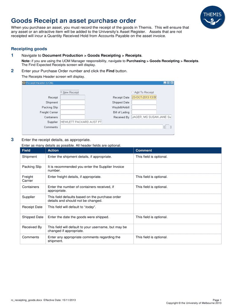 Goods Receipt an asset purchase order When you purchase an asset, you must record the receipt of the goods in Themes. This will ensure that any asset or an attractive item will be added to the Universities