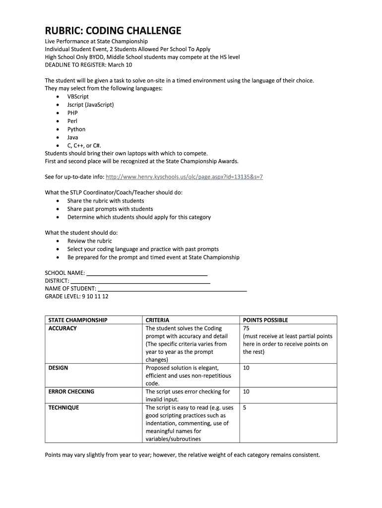 RUBRIC: CODING CHALLENGE Live Performance at State Championship Individual Student Event, 2 Students Allowed Per School To Apply High School Only BYOD, Middle School students may compete at the HS