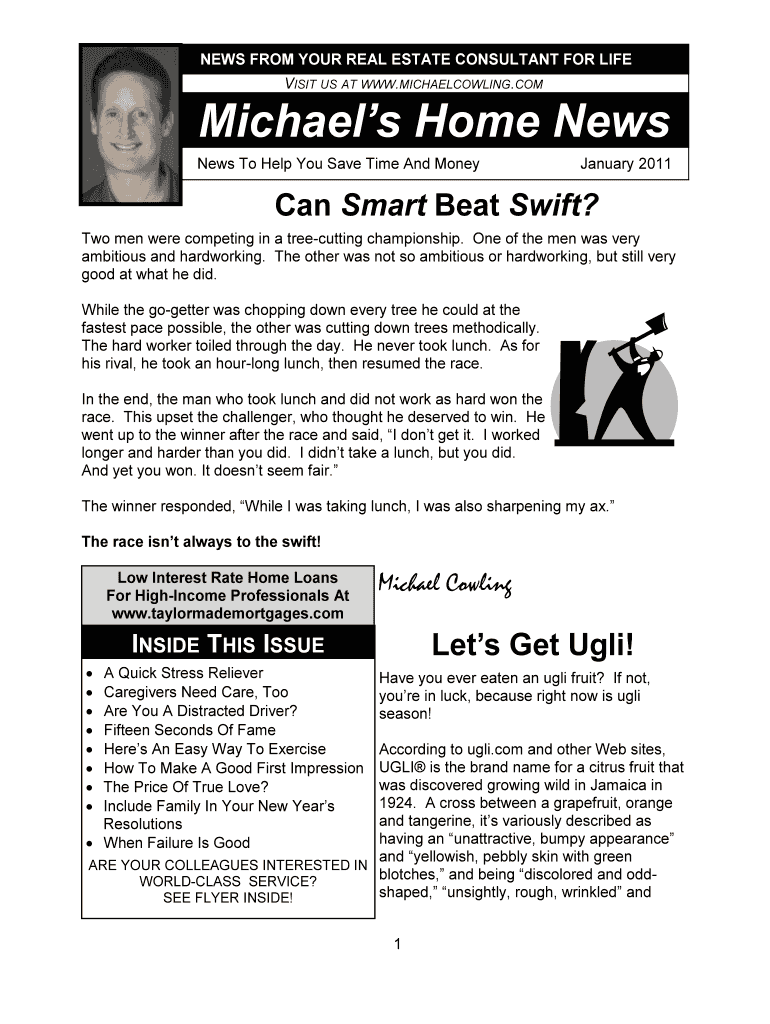 NEWS FROM YOUR REAL ESTATE CONSULTANT FOR LIFE VISIT US AT WWW.MICHAELCOWLING.COM Michael's Home News To Help You Save Time And Money January 2011 Can Smart Beat Swift? Two men were competing in a