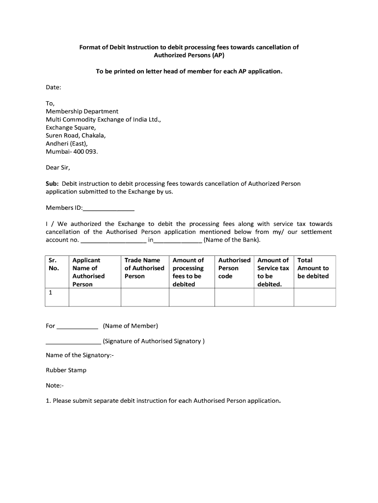 Format of Debit Instruction to debit processing fees towards cancellation of Authorized Persons (AP) To be printed on letter head of member for each AP application. Date: To, Membership Department