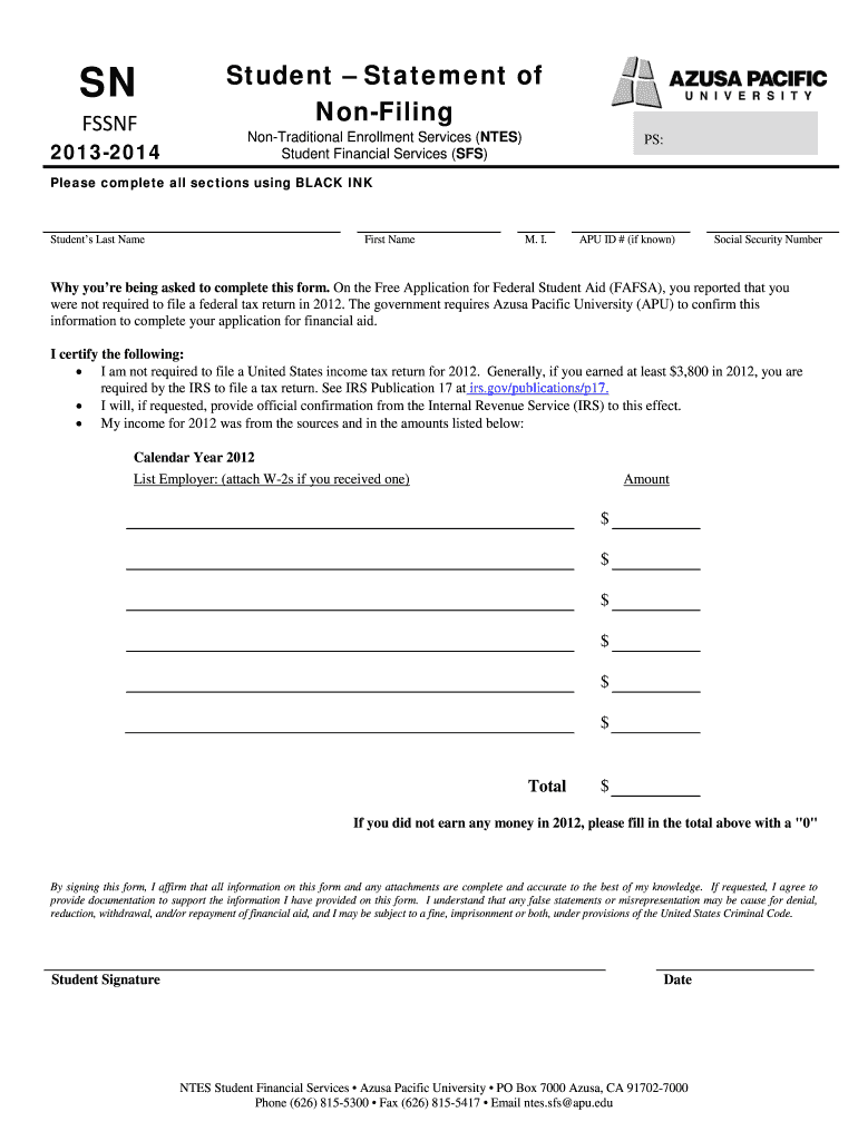 This form is particularly relevant for students who did not earn sufficient income to meet the federal tax filing requirements. To be eligible to use the non-filing form, a student typically must demonstrate that their income was below a certain threshold. Understanding the eligibility criteria for the Student Financial Services Non-Filing Form is vital for those seeking financial aid at Azusa Pacific University.