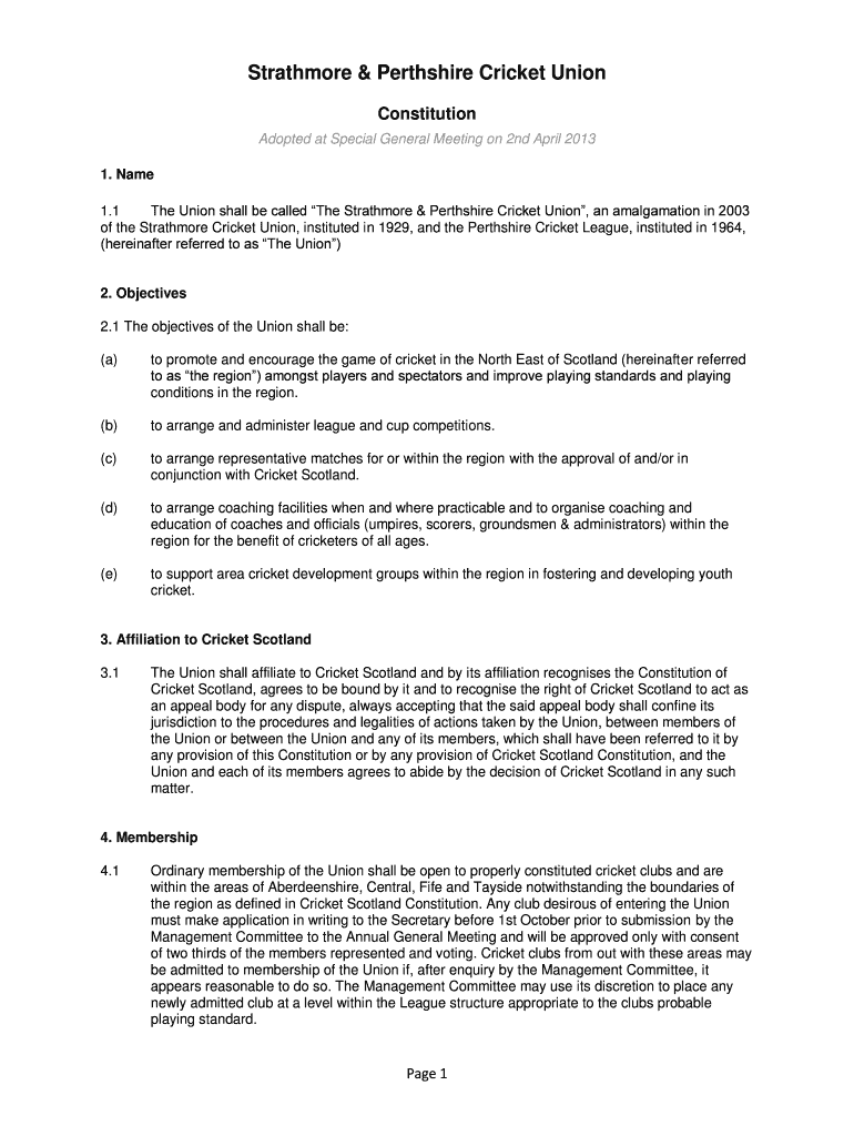 Stratford & Perth shire Cricket Union Constitution Adopted at Special General Meeting on 2nd April 2013 1. Name 1.1 The Union shall be called The Stratford & Perth shire Cricket Union, an amalgamation