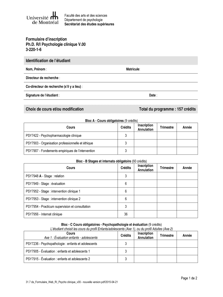 Faculty DES arts et DES sciences Department DE psychologies Secretariat DES tubes sunroofs Formula ire inscription Ph.D. R×I Psychologies Clinique V.00 322016 Identification DE students Not, Prom