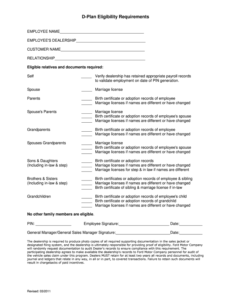 Plan Eligibility Requirements EMPLOYEE NAME EMPLOYEE IS DEALERSHIP CUSTOMER NAME RELATIONSHIP Eligible relatives and documents required: Self Verify dealership has retained appropriate payroll records