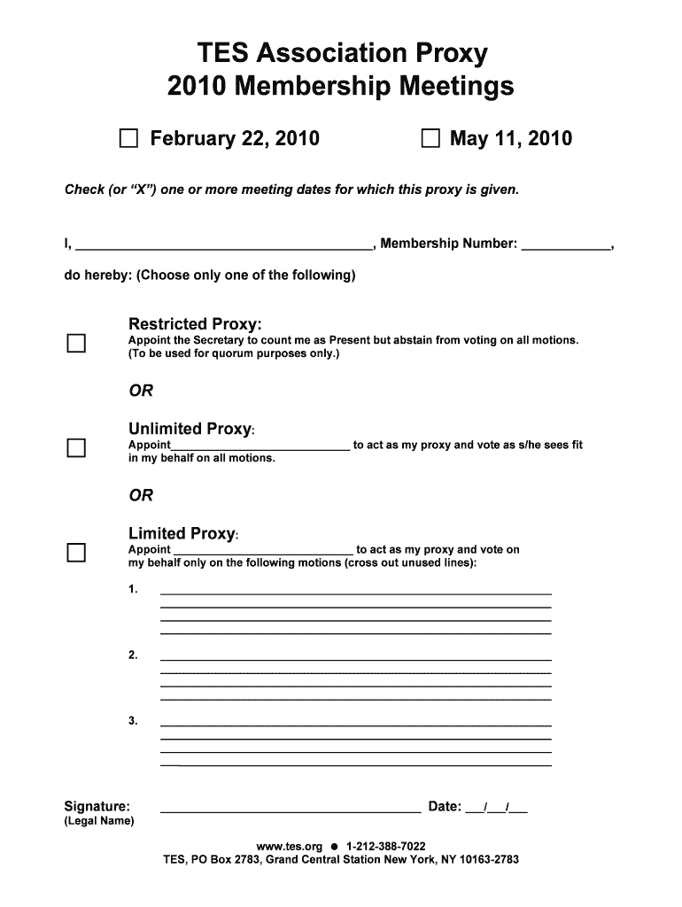 TES Association Proxy 2010 Membership Meetings February 22, 2010, May 11, 2010, Check (or X) one or more meeting dates for which this proxy is given. I, Membership Number:, do hereby: (Choose only