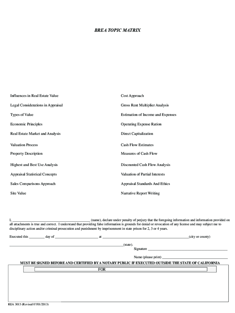 The BREA Topic Matrix Form includes various essential fields and checkboxes that guide students in accurately reporting the topics studied in their courses. A notable requirement is that any forms executed outside of California must be notarized to ensure authenticity. This emphasizes the importance of proper completion and submission to uphold educational integrity.