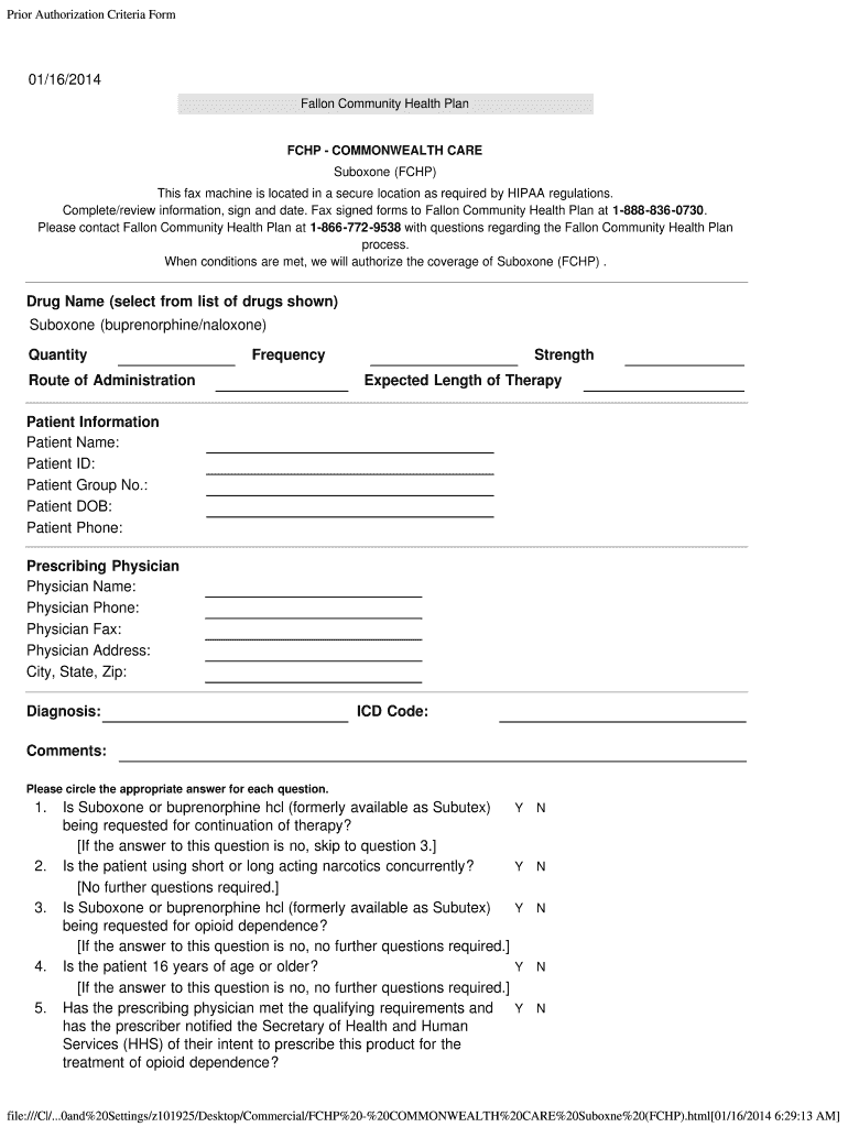 Prior Authorization Criteria Form 01×16/2014 Fallon Community Health Plan CHP COMMONWEALTH CARE Suboxone (CHP) This fax machine is located in a secure location as required by HIPAA regulations. Complete×review