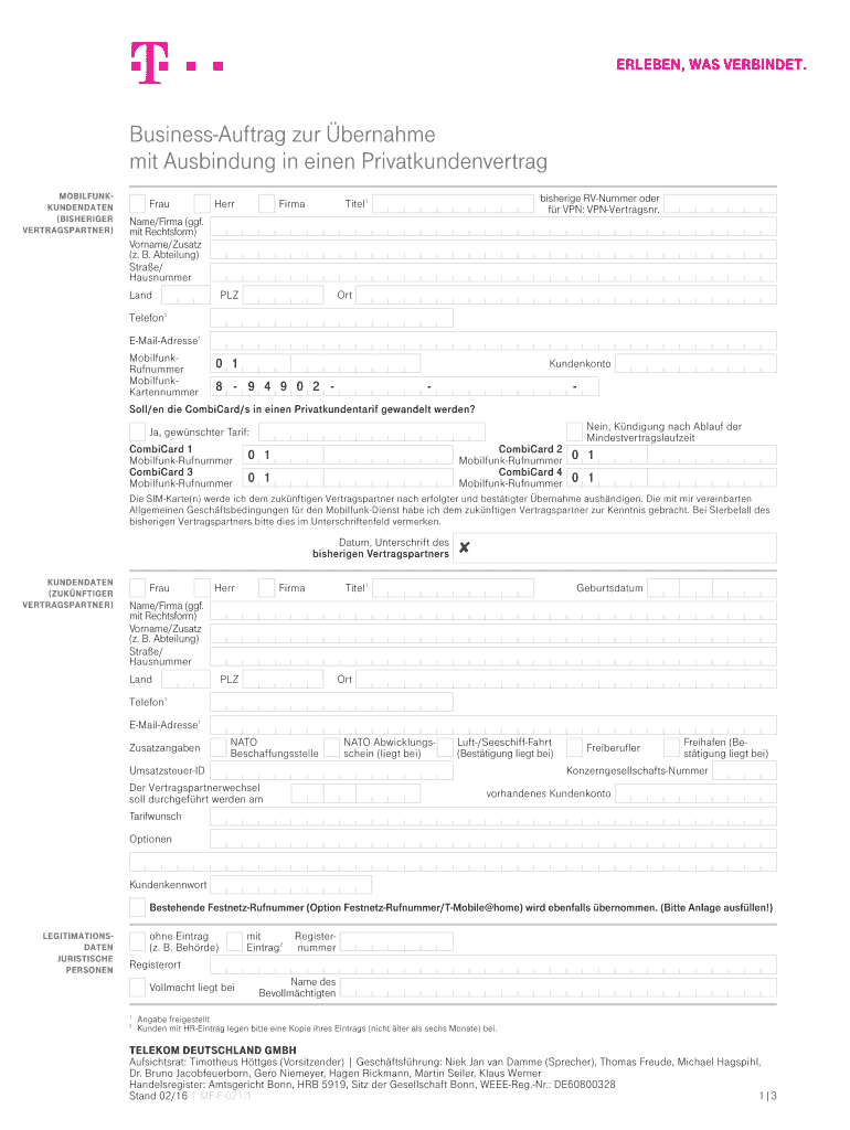 ELEVEN, WAS VERBIAGE. BusinessAuftrag our Bernanke MIT Unbinding in linen Privatkundenvertrag MOBILFUNKKUNDENDATEN (FISHERIES VERTRAGSPARTNER) Frau Herr fisheries Renumber Oder for VPN: VPNVertragsnr.