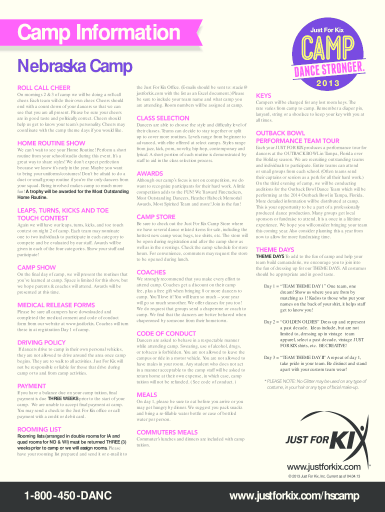 Camp Information Nebraska Camp ROLL CALL CHEER On mornings 2 & 3 of camp we will be doing a roll call cheer. Each team will do their own cheer. Cheers should end with a count-down of your dancers