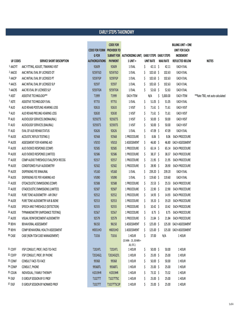 EARLYSTEPSTAXONOMY 1 2 3 4 5 6 7 8 9 10 11 12 13 14 15 16 17 18 19 20 21 22 23 24 25 26 27 28 29 30 CODES AAC FIT AA CIO AA CIP AAC IS AA CRS ASS TASTE AUD AUD AUD AIDE AIDE AIDE BEH CASE SERVICESHORTDESCRIPTION