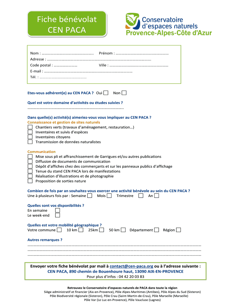 Toute personne bénévole dans la région doit déposer la fiche bnvolat-cen paca.