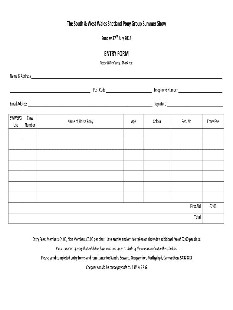 The South & West Wales Shetland Pony Group Summer Show Sunday 27th July 2014 ENTRY FORM Please Write Clearly. Thank You. Name & Address Post Code Telephone Number Email Address Signature SWISS Use