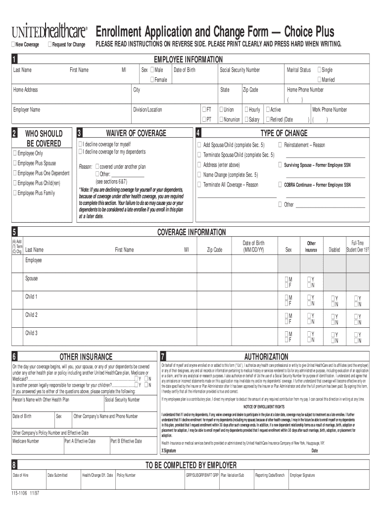 The Choice Plus Enrollment Application Form is a health insurance enrollment document used by employees to apply for or modify their health coverage.