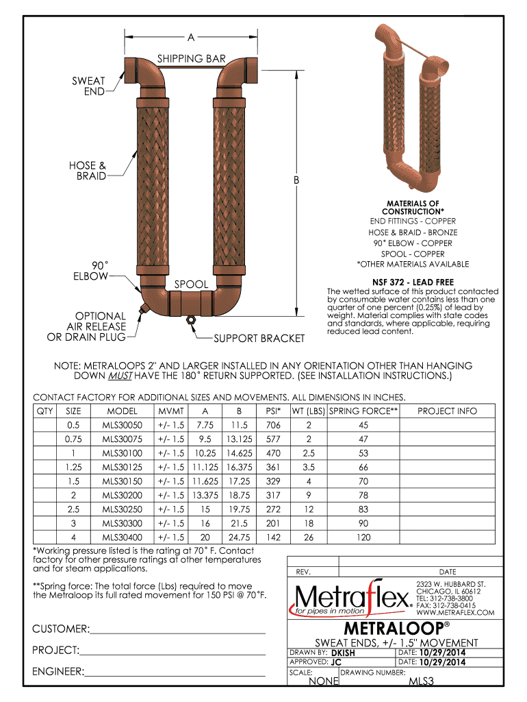 A SHIPPING BAR SWEAT END HOSE & BRAID B 90 ELBOW MATERIALS OF CONSTRUCTION* END FITTINGS — COPPER HOSE & BRAID — BRONZE 90 ELBOW — COPPER SPOOL — COPPER *OTHER MATERIALS AVAILABLE NSF 372