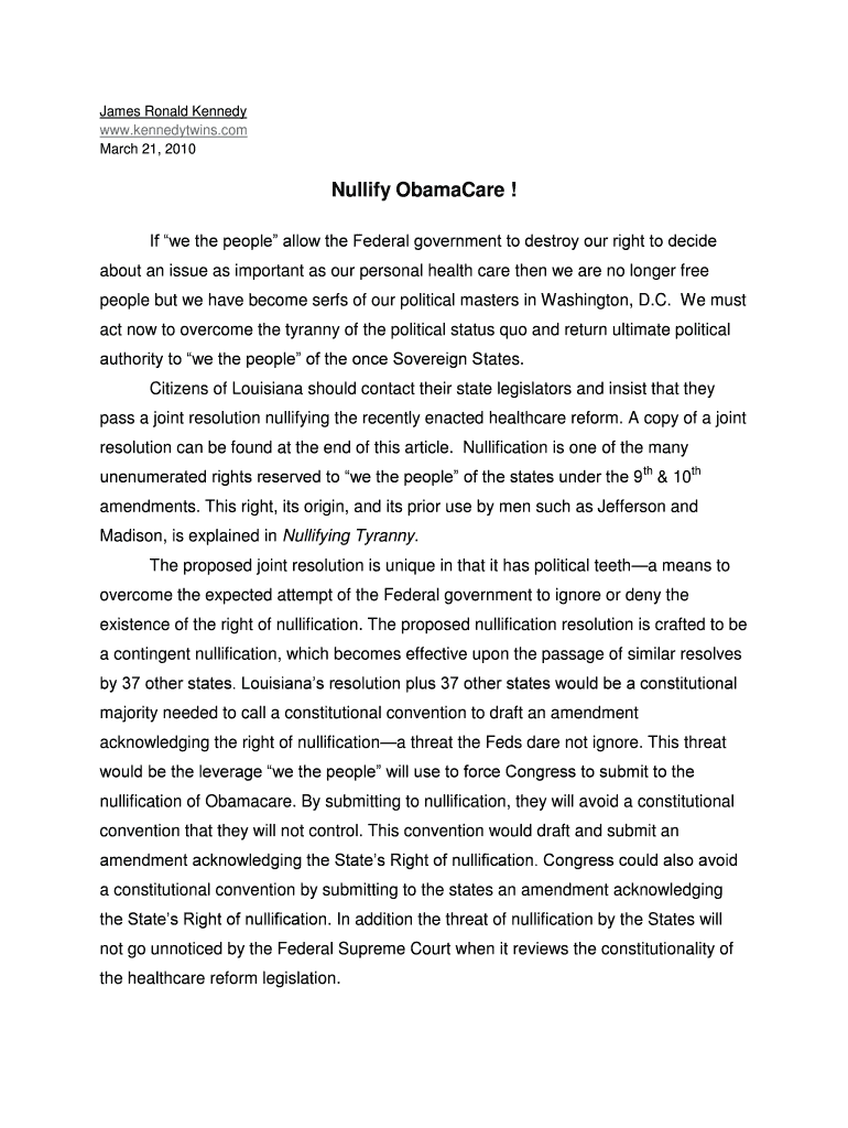 James Ronald Kennedy www.kennedytwins.com March 21, 2010, Nullify Obamacare ! If we the people allow the Federal government to destroy our right to decide about an issue as important as our personal