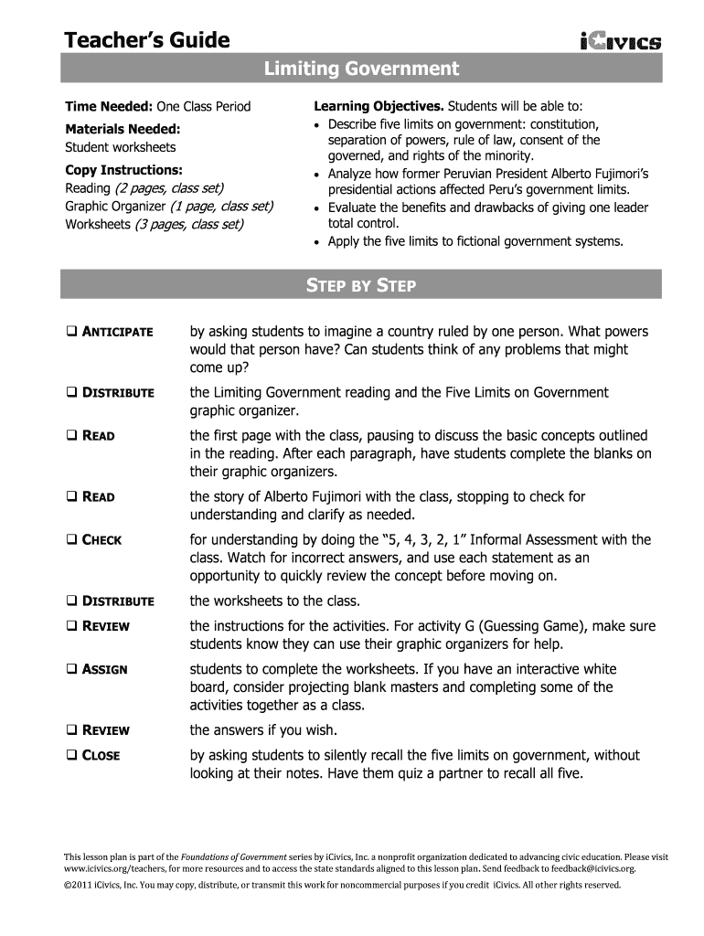 Teacher s Guide Limiting Government Time Needed: One Class Period Materials Needed: Student worksheets Copy Instructions: Reading (2 pages, class set) Graphic Organizer (1 page, class set) Worksheets
