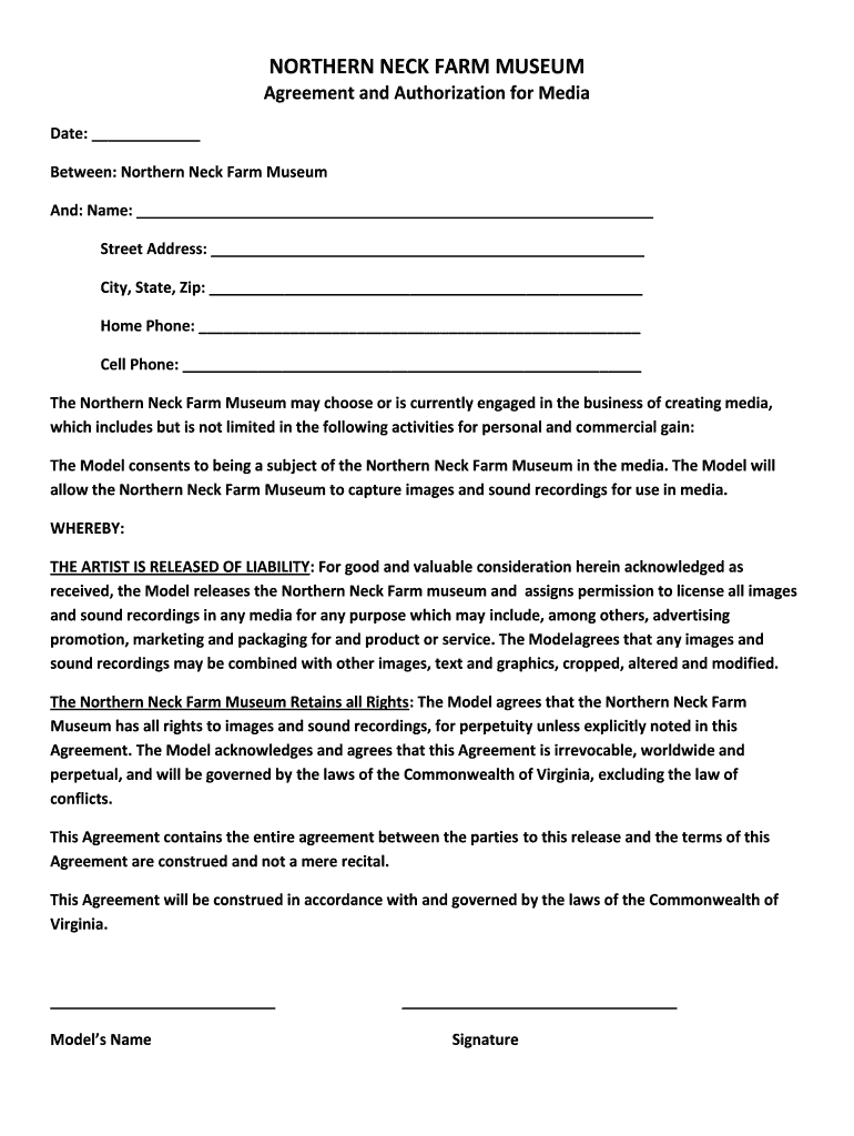 NORTHERN NECK FARM MUSEUM Agreement and Authorization for Media Date: Between: Northern Neck Farm Museum And: Name: Street Address: City, State, Zip: Home Phone: Cell Phone: The Northern Neck Farm