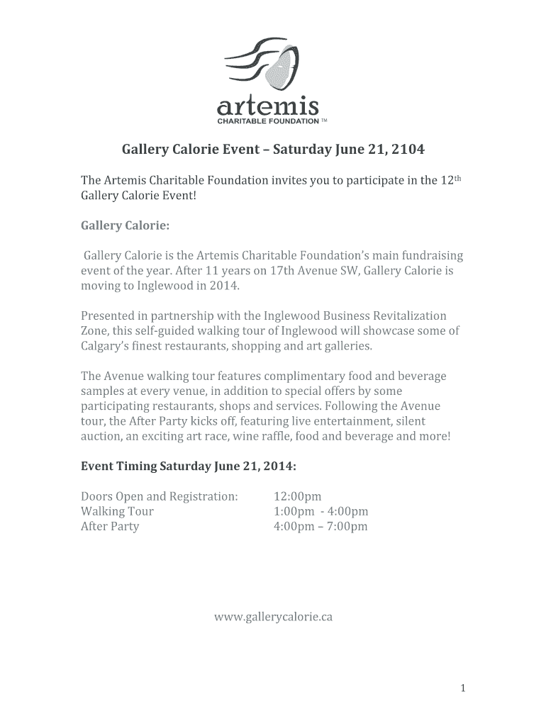 Gallery Calorie Event Saturday, June 21, 2104, The Artemis Charitable Foundation invites you to participate in the 12th Gallery Calorie Event! Gallery Calorie: Gallery Calorie is the Artemis Charitable