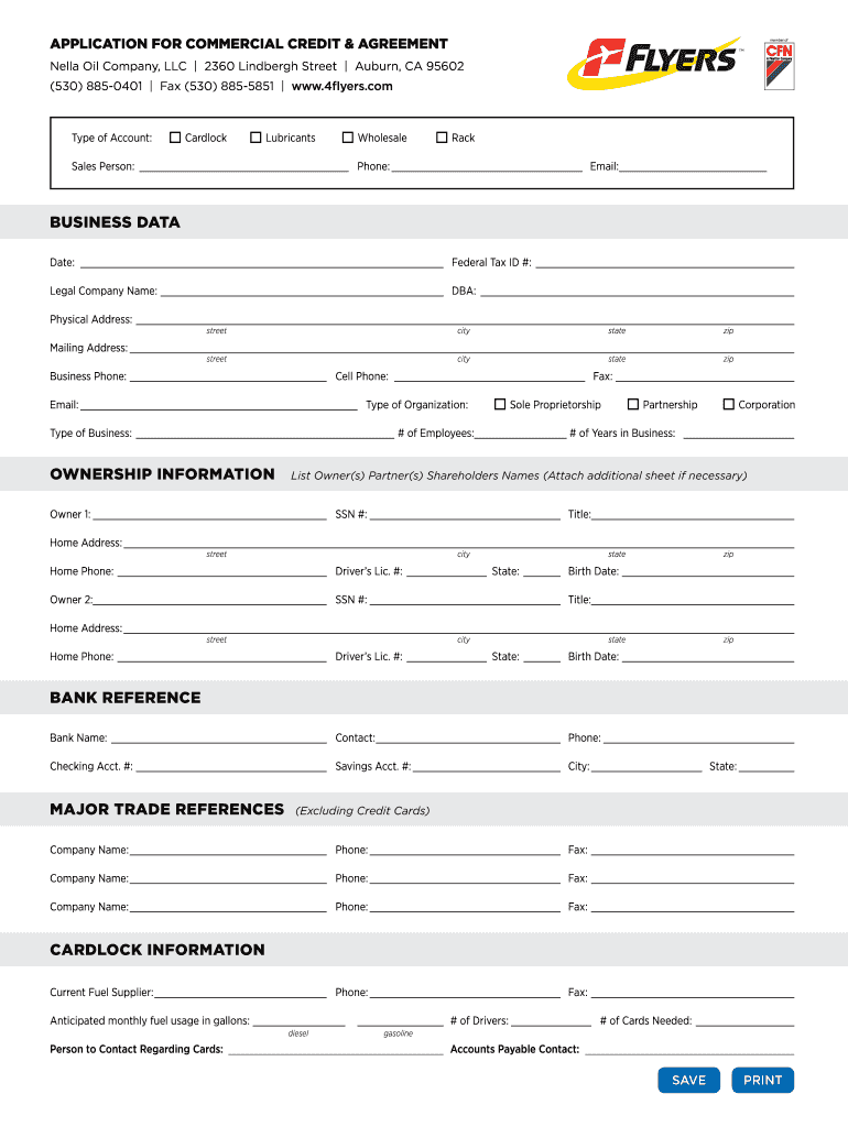 APPLICATION FOR COMMERCIAL CREDIT & AGREEMENT member of Ella Oil Company, LLC 2360 Lindbergh Street Auburn, CA 95602 ×530× 8850401 Fax (530× 8855851 www.4flyers.com Type of Account: Card lock Lubricants