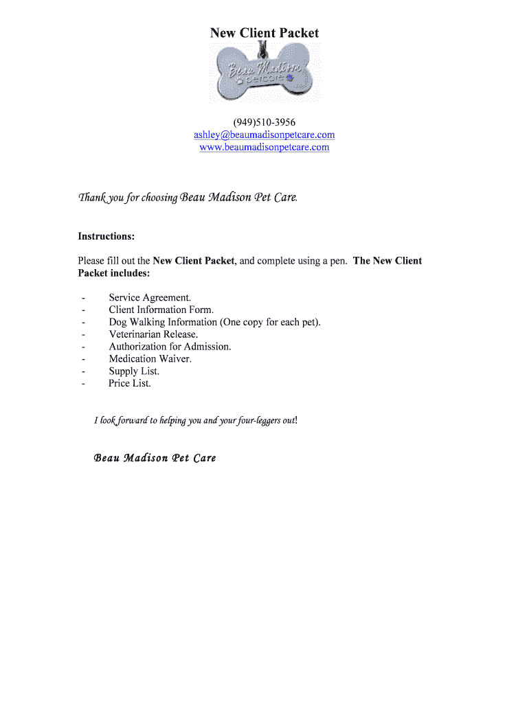 New Client Packet (949×5103956 Ashley beaumadisonpetcare.com www.beaumadisonpetcare.com Thank you for choosing Beau Madison Pet Care. Instructions: Please fill out the New Client Packet, and complete