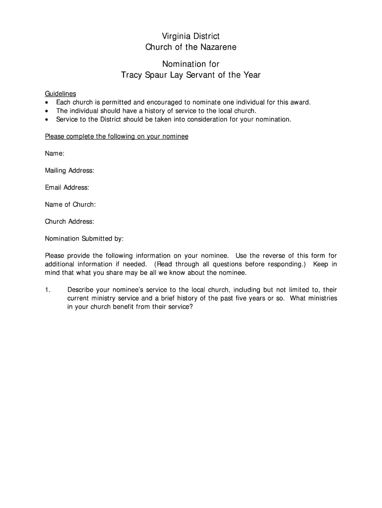 Virginia District Church of the Nazarene Nomination for Tracy Spur Lay Servant of the Year Guidelines Each church is permitted and encouraged to nominate one individual for this award. The individual