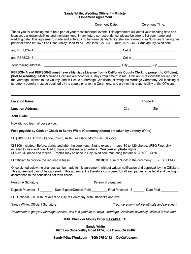 Sandy White, Wedding Officiant Minister Elopement Agreement Ceremony Date: Ceremony Time: Thank you for choosing me to be a part of your most important event! This agreement will detail your wedding