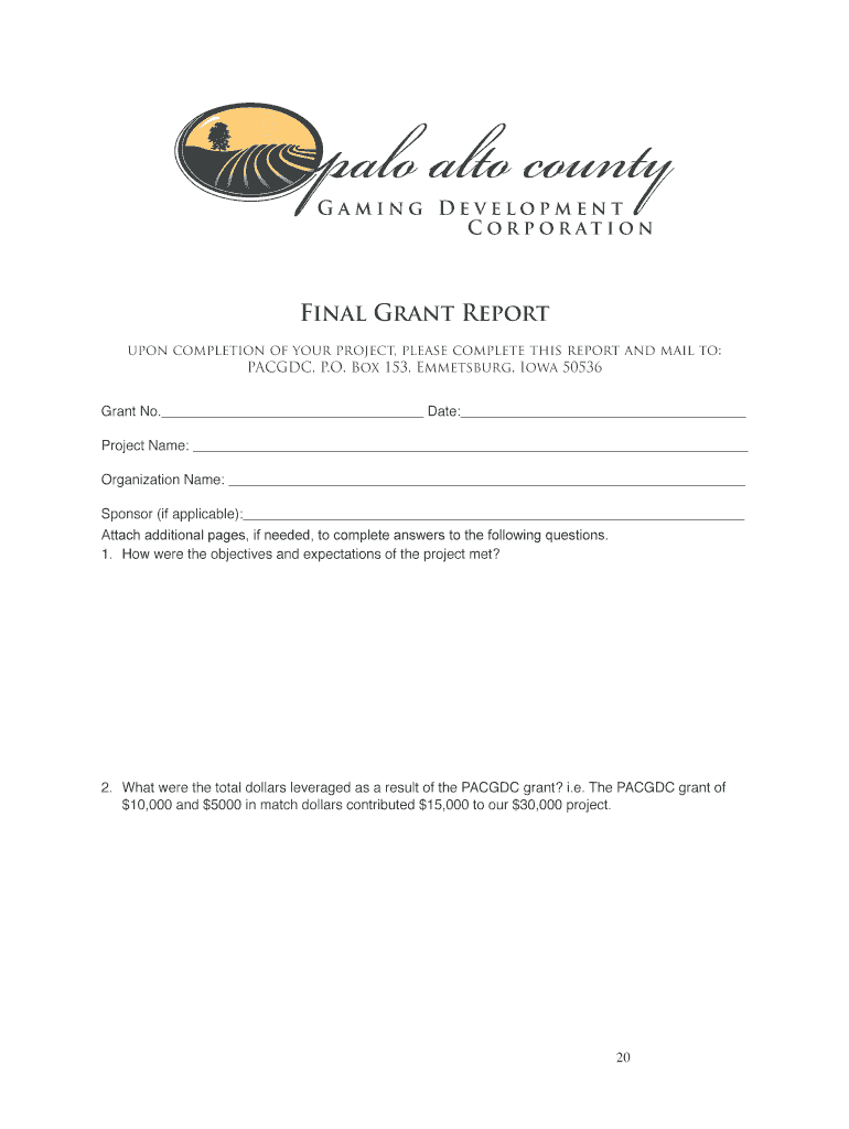 Final Grant Report upon completion of your project, please complete this report and mail to: PAC GDC, P.O. Box 153, Eldersburg, Iowa 50536 Grant No. Date: Project Name: Organization Name: Sponsor