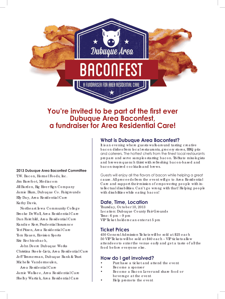 Dubuque Area Bacon fest A Fundraiser for Area Residential Care You're invited to be part of the first ever Dubuque Area Bacon fest, a fundraiser for Area Residential Care! What is Dubuque Area Bacon
