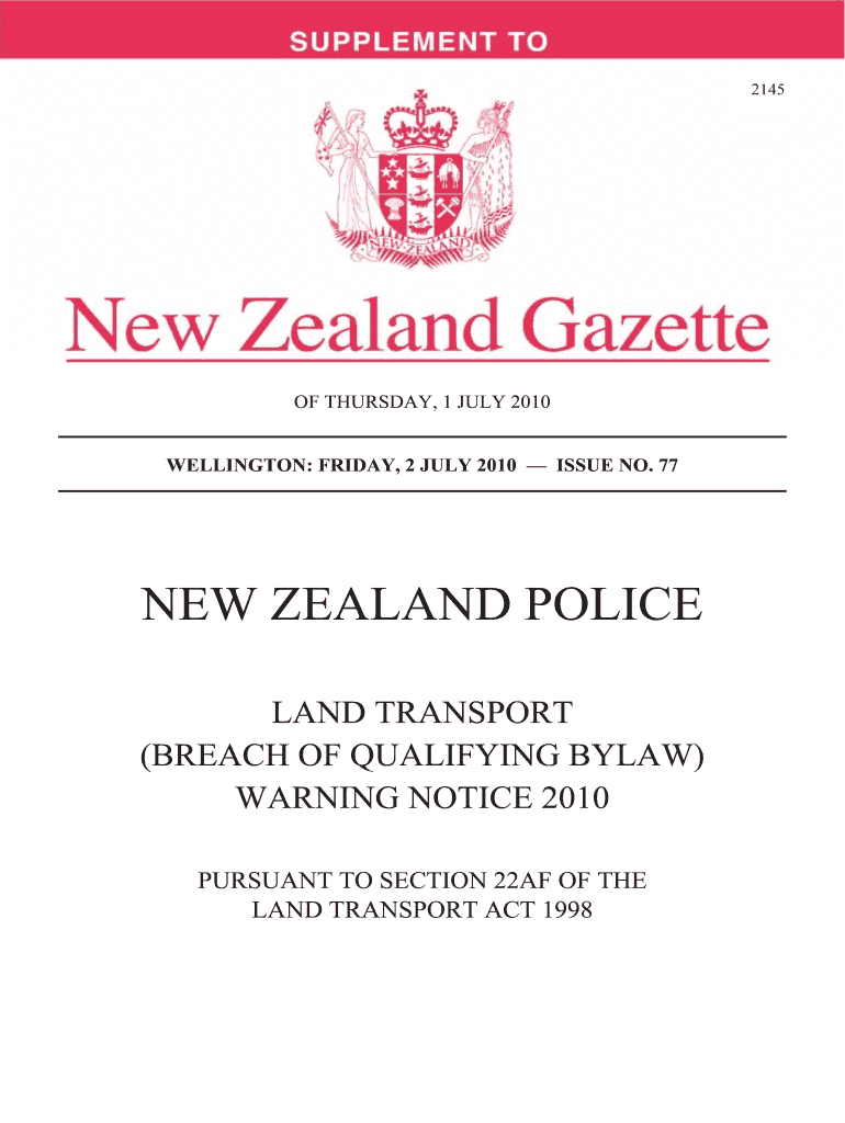 The Land Transport (Breach of Qualifying Bylaw) Warning Notice 2010 is a legal document mandated by the Land Transport Act 1998, aimed at addressing breaches of regulatory bylaws pertaining to vehicle operations. This notice serves as a notification to vehicle operators regarding their compliance status and must be affixed to the vehicle for a duration of 90 days. Its key components detail the specific bylaws violated and the consequences that may occur if further infractions happen.