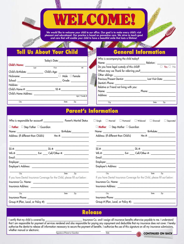 Parents or legal guardians of the child patient are required to fill out and file the new child patient forms.