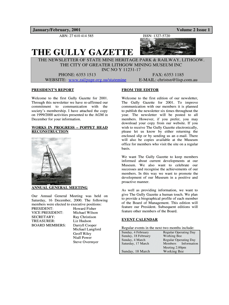 January×February 2001 Volume 2 Issue 1 ABN: 27 610 414 585 ISSN: 13275720 THE GULLY GAZETTE THE NEWSLETTER OF STATE MINE HERITAGE PARK & RAILWAY, LITHGOW. THE CITY OF GREATER LITHGOW MINING MUSEUM