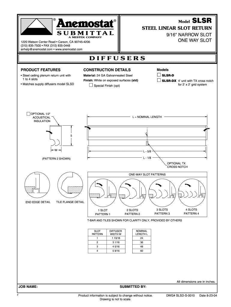 Model SSR STEEL LINEAR SLOT RETURN 9×16 NARROW SLOT ONE WAY SLOT S U B M I T TA L A MASTER COMPANY 1220 Watson Center Road Carson, CA 907454206 ×310× 8357500 FAX (310× 8350448 air help anemostat.com