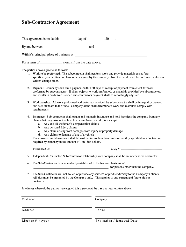 Get the free Sub-Contractor Agreement - iwce-visioncom