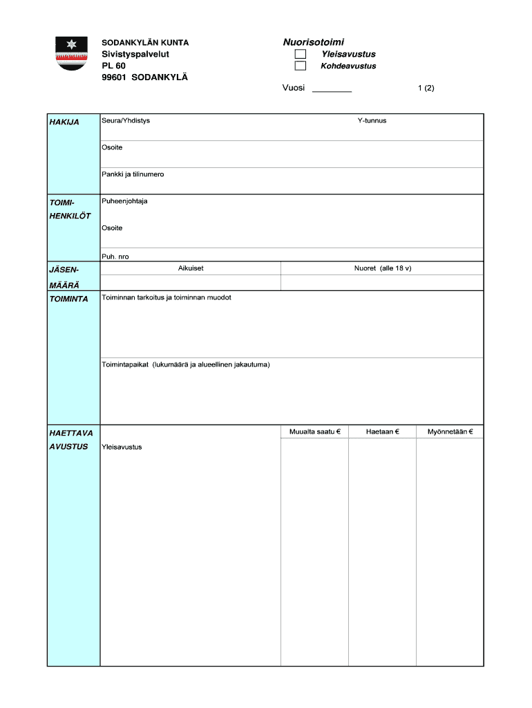 Get the free Nuorisotoimen yleis- ja kohdeavustus hakulomake.pdf - sodankyla