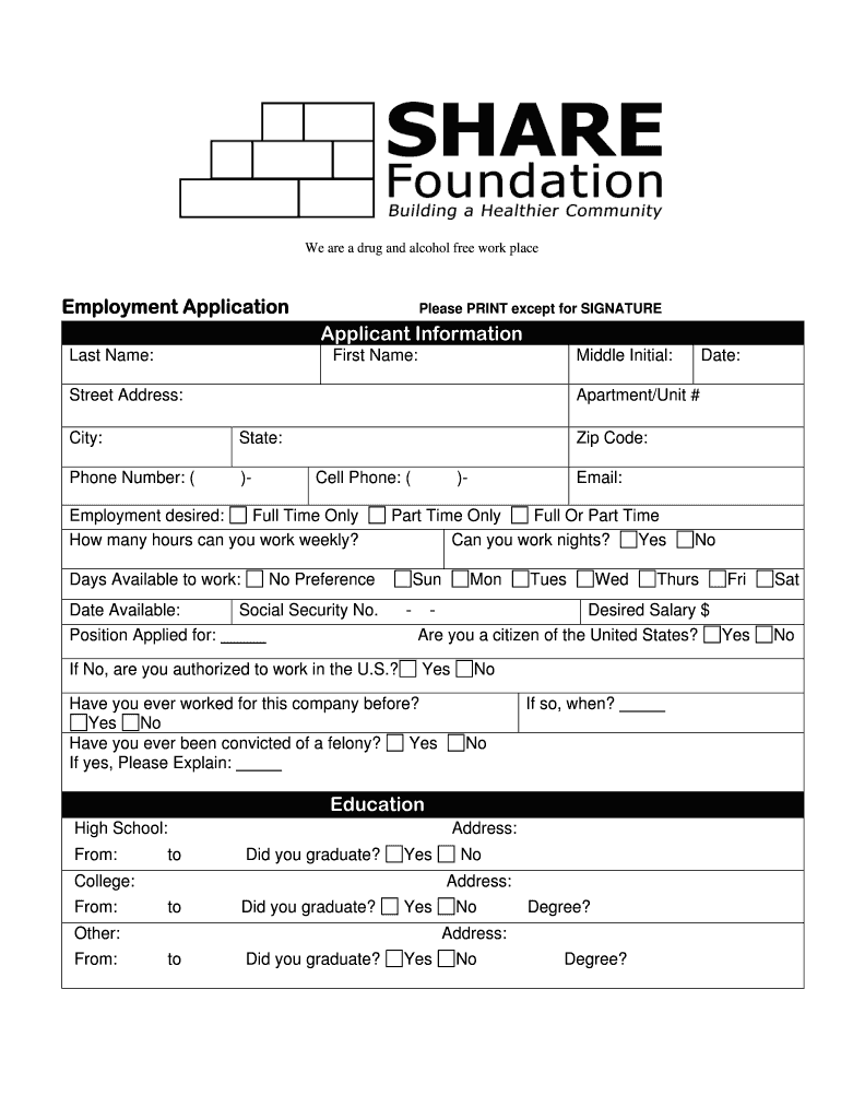 Get the We are a drug and alcohol free work place Employment Application Please PRINT except for ...