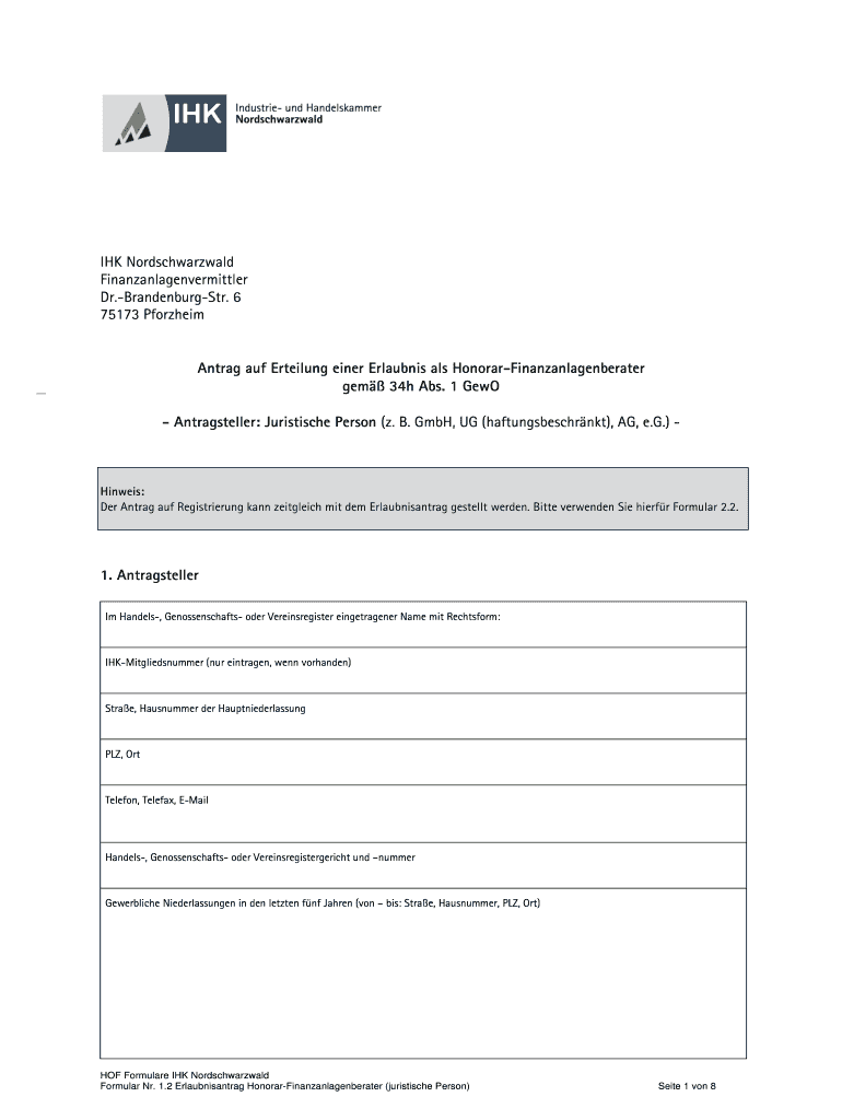 INK Nordschwarzwald Finanzanlagenvermittler Dr. Brandenburg. 6 75173 Pforzheim Ant rag AUF Derailing anger Erlaubnis ALS HonorarFinanzanlagenberater gem 34h Abs. 1 Good Antragsteller: Juristic Person