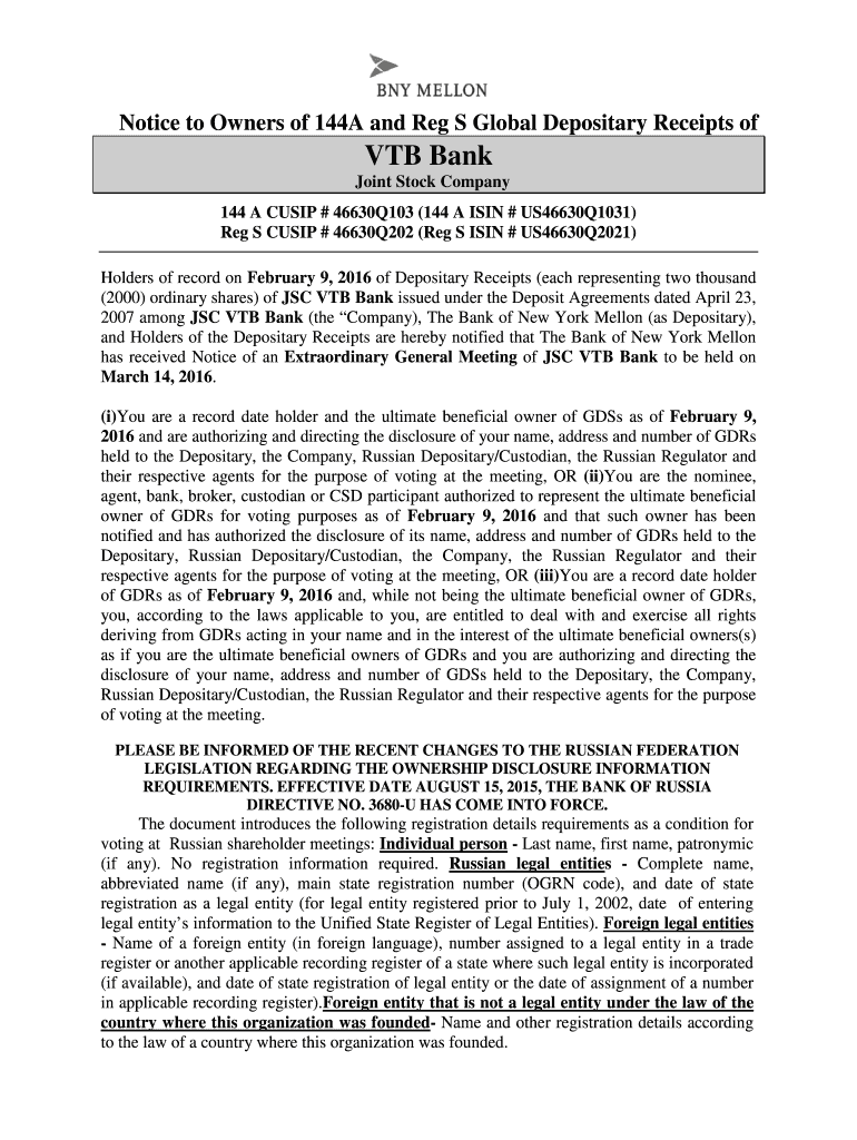 Notice to Owners of 144A and Reg S Global Depository Receipts of MTB Bank Joint Stock Company 144 A CUSP # 46630Q103 (144 A ISIN # US46630Q1031) Reg S CUSP # 46630Q202 (Reg S ISIN # US46630Q2021)