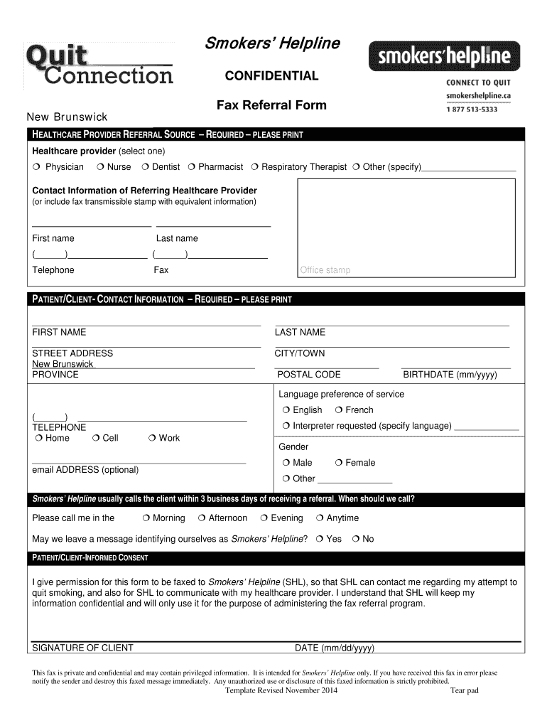 Smokers Helpline CONFIDENTIAL Fax Referral Form New Brunswick HEALTHCARE PROVIDER REFERRAL SOURCE REQUIRED PLEASE PRINT Healthcare provider (select one) Physician Nurse Dentist Pharmacist Respiratory