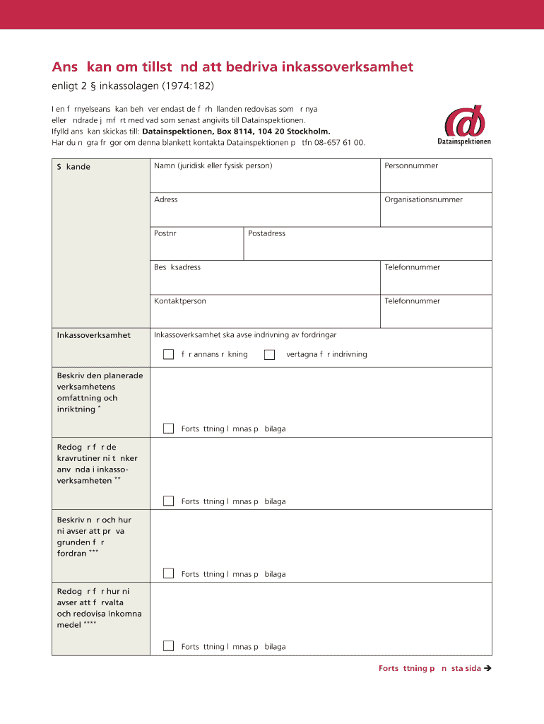 Get the free Blankett - Anskan om tillstnd att bedriva inkassoverksamhet - Datainspektionen