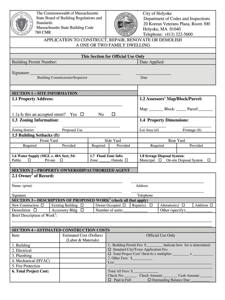 The Massachusetts Building Permit Application is a government form used by property owners to apply for permits to construct, repair, renovate, or demolish one or two-family dwellings in Holyoke.