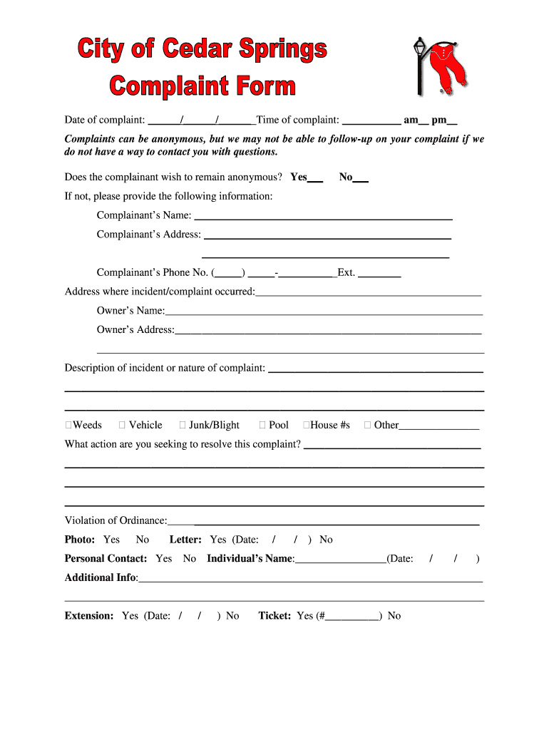 Get the free Complaint Form