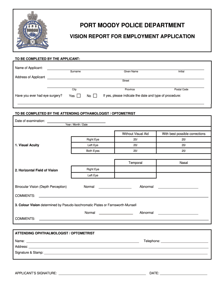PORT MOODY POLICE DEPARTMENT VISION REPORT FOR EMPLOYMENT APPLICATION TO BE COMPLETED BY THE APPLICANT: Name of Applicant: Surname Given Name Initial Address of Applicant Street City Have you ever