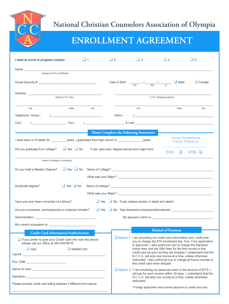 National Christian Counselors Association of Olympia ENROLLMENT AGREEMENT 1 I want to enroll in program number: 2 3 4 5 Name (please print for certificate) Social Security # Address Date of Birth