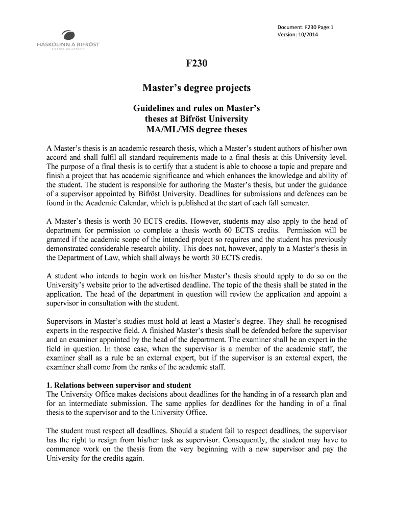 Document: F230 Page:1 Version: 10×2014 F230 Master’s degree projects Guidelines and rules on Master’s theses at First University MA×ML/MS degree theses A Master’s thesis is an academic research