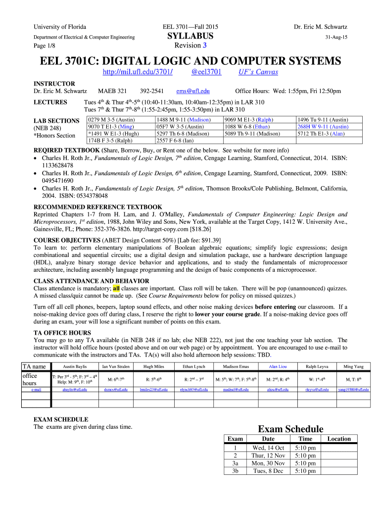 University of Florida EEL 3701Fall 2015 Dr. Eric M. Schwartz SYLLABUS Department of Electrical & Computer Engineering 31Aug15 Revision 3-Page 1×8 EEL 3701C: DIGITAL LOGIC AND COMPUTER SYSTEMS HTTP://mil.NFL.edu×3701/