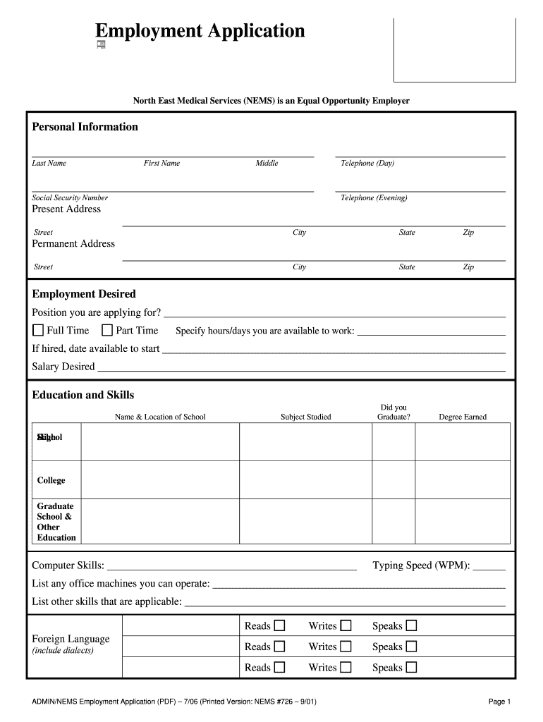 While the Employment Application Form does not specify a strict deadline, it is recommended to submit applications promptly as hiring processes may vary. Check directly with NEMS for specific timelines related to job openings.