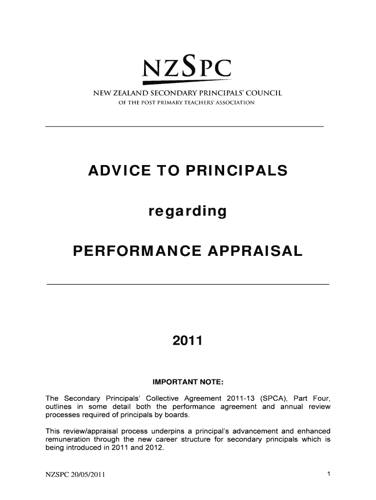 ADVICE TO PRINCIPALS regarding PERFORMANCE APPRAISAL 2011 IMPORTANT NOTE: The Secondary Principals Collective Agreement 2011-13 (SPCA×, Part Four, outlines in some detail both the performance agreement