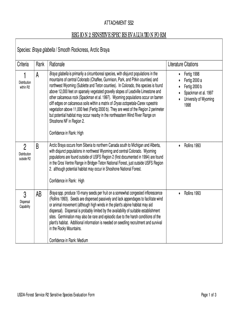 This document evaluates the sensitive species Braya glabella (Smooth Rockcress, Arctic Braya) found in Region 2, detailing its distribution, population trends, habitat vulnerability, and historical