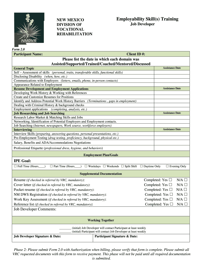 Get the free Employability Skills Training: Form 2.0 - Division of Vocational ... - dvr state nm